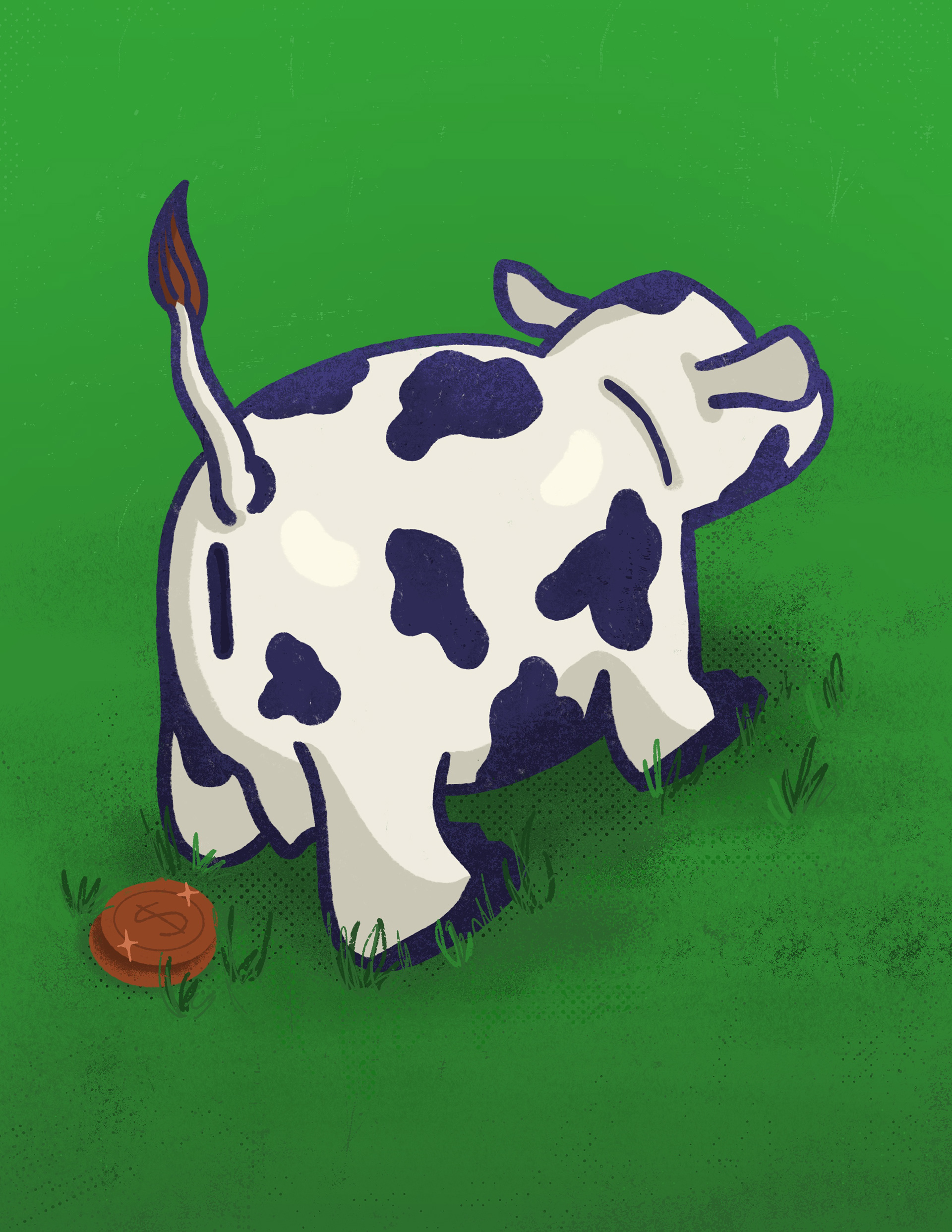 I felt a reference towards the universally-recognizable piggy bank would connect with the widest audience, while still grounding it in a farmer's pasture of green. Finally, the pennies were drawn in a manner and placement as to drum up images of cow feces, without being crass or disgusting. The style of this piece was meant to be as smooth and readymade in appearance as possible, with the grass being the natural exception.